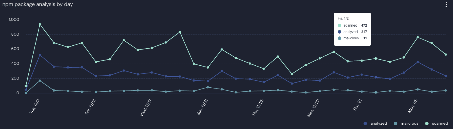 We are now scanning all 20,000+ npm packages daily, giving us ~500/day packages with install scripts, ~200/day with interesting static analysis results, narrowed down to ~20/day LLM verified as likely malicious for human review. Panther’s AI alert triage reduces this even further, allowing us to focus our research efforts on what really matters.