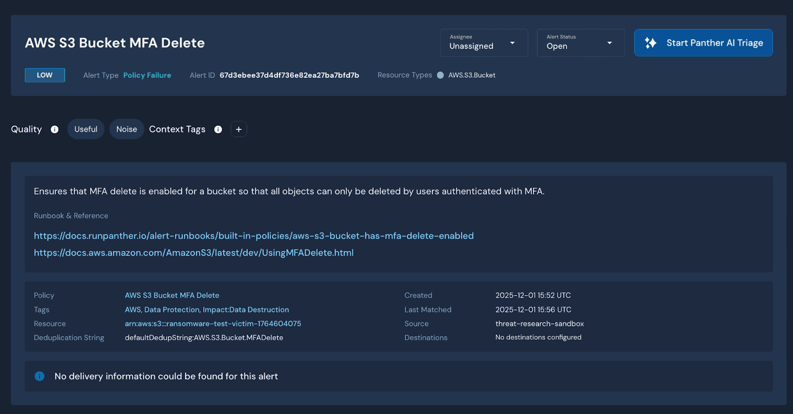 Panther policies can be used to identify buckets with these specific settings disabled, and they are available here. For example, having MFADelete disabled in an S3 bucket will result in the following policy failure, and show up in the Alerts section of your Panther instance: