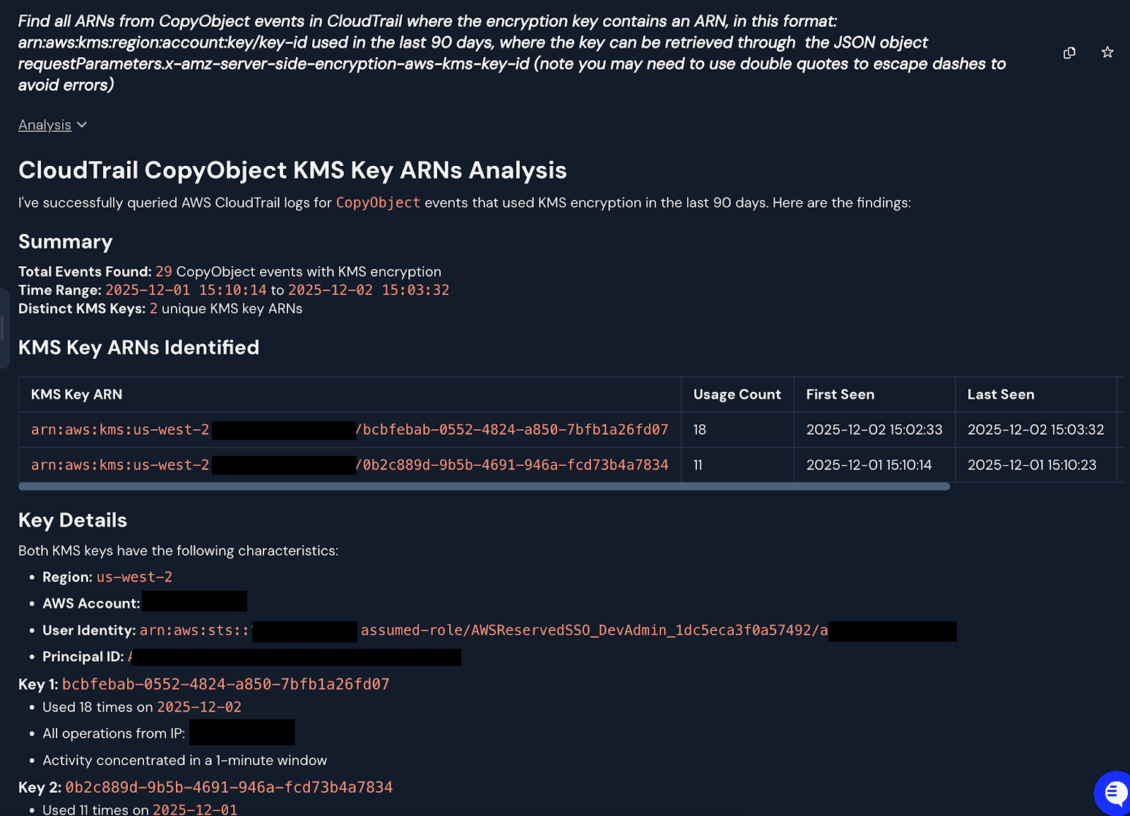 To identify a baseline of legitimate operations involving cross-accounts, you can query your logs with Panther AI to extract which KMS keys, if any, were found performing CopyObject operations on your buckets. From there, it is possible to extract and summarize the KMS key account IDs from the ARNs to populate the inline filters above.