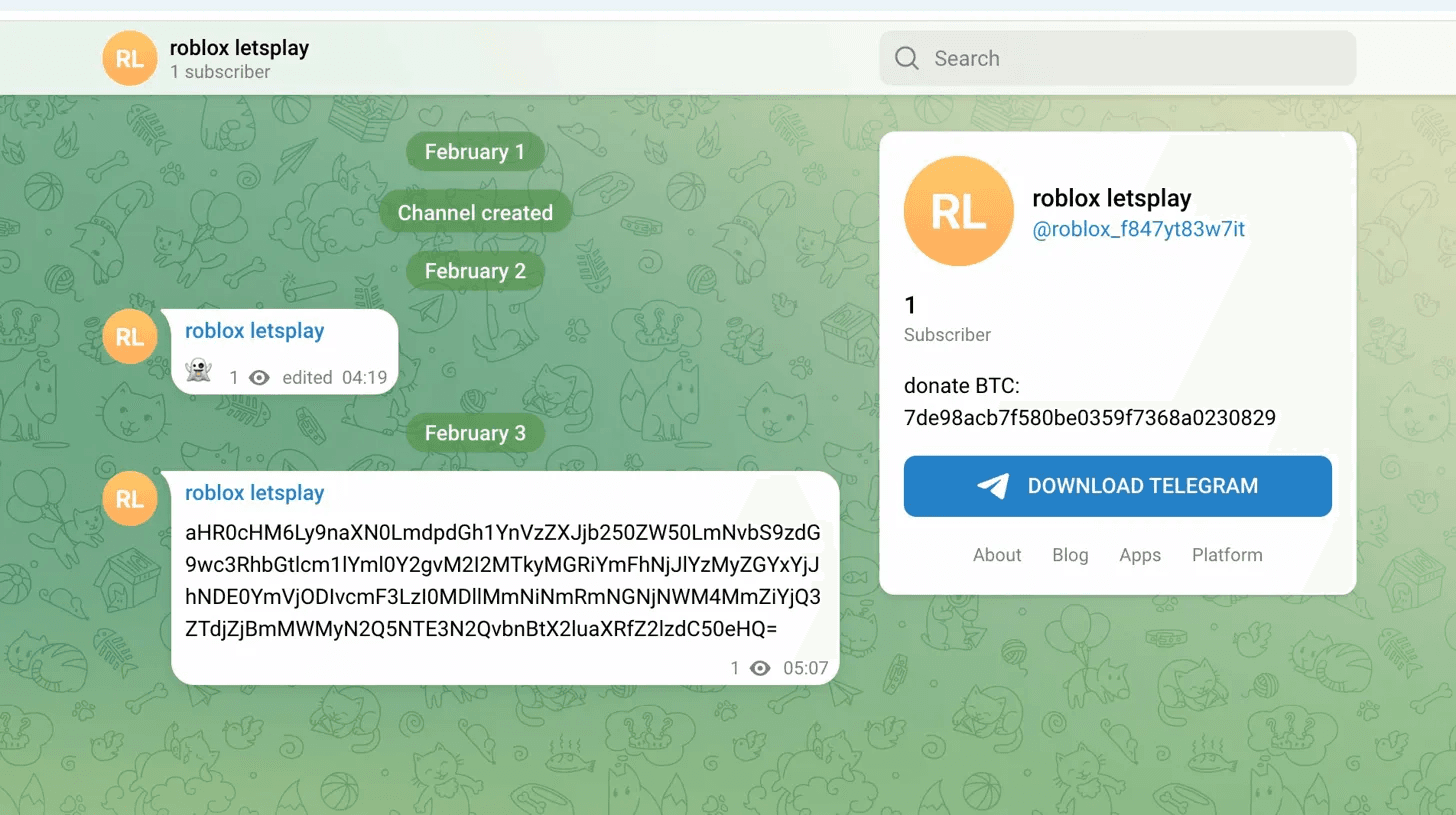 It then decodes the Telegram channel URL, encoded in base64 and with characters reversed: