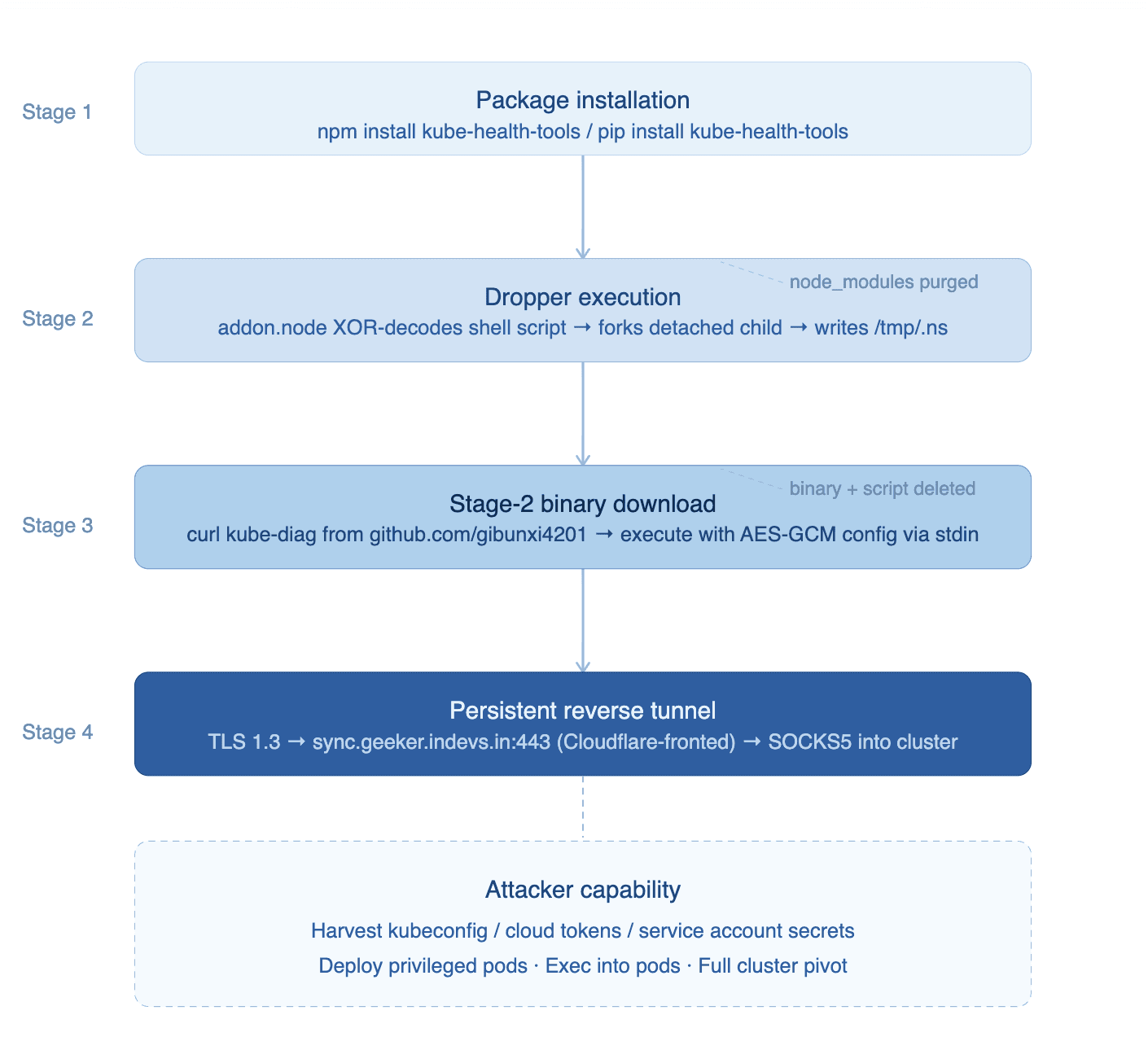 Each stage is designed to hand off cleanly to the next while shedding forensic evidence behind it. By the time a defender notices something is wrong, the dropper is gone, the download script is gone, the binary has renamed itself node-health-check, and the only remaining artifact is an encrypted config file in /tmp. The tunnel, meanwhile, has been open for however long it took to detect. If long enough, in a Kubernetes environment, the attacker can harvest credentials, enumerate cluster resources, and establish persistence that survives removal of the original infection vector.
