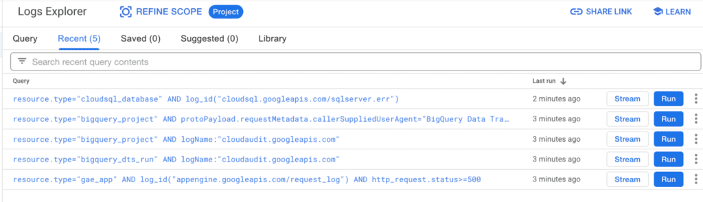 The most frequently used of the three are Admin activity logs. These logs record administrative changes in cloud resources such as Google Cloud Storage (GCS), Compute Engine (GCE), PubSub, and more. An event can be generated when a resource is created, modified, or updated. You can access any of these logs by going into the Logs Explorer within your GCP console.