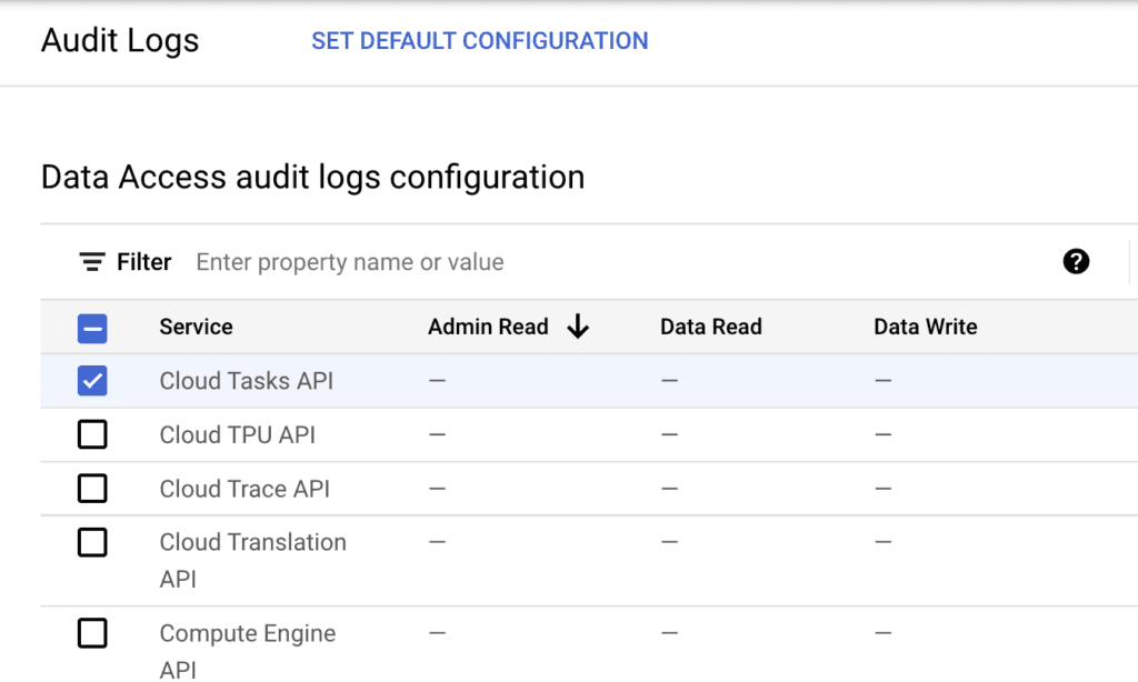Data Access Logs tell you the “who” about your data within a GCP resource such as Big Query. Meaning that when a user manipulates data within the Big Query data warehouse, data access logs will track who made the change. It’s important to note that data access logs are not turned on by default for cloud resources except for Big Query. Google recommends that these logs be activated as much as possible, as it provides higher visibility for a security team as well as Google’s support team. However, to keep ingestion costs down, we recommend turning on data access logs on critical applications or storage buckets with highly sensitive data.