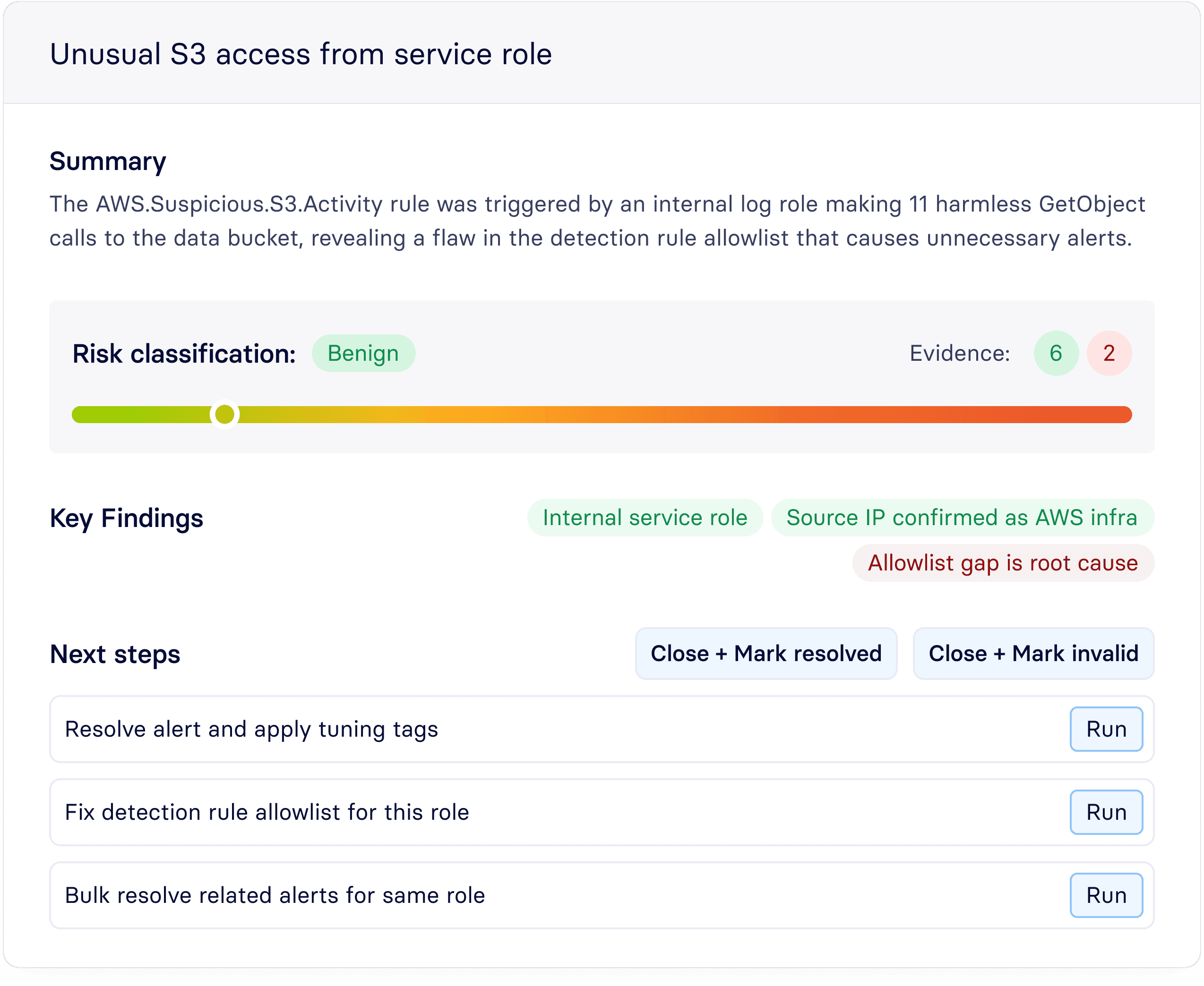 From prompt to investigation, and beyond. Clear risk classification, benign alert closure, detection improvements—all with audit trails.