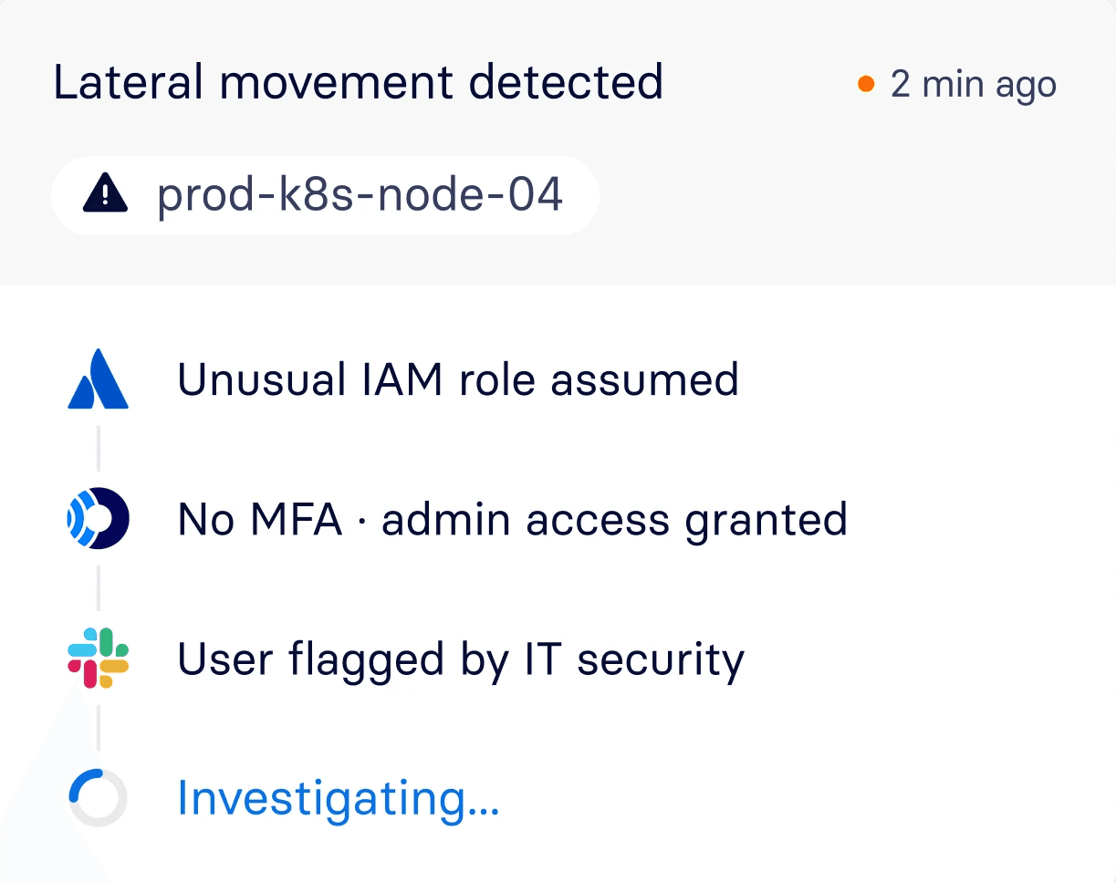 Panther AI doesn't summarize alerts and wait for instructions. It investigates, pivoting across your data lake, reviewing alert history, and pulling live context from your identity provider, code repos, and ticketing systems. Every investigation delivers a definitive risk classification with transparent reasoning, not a probability score.