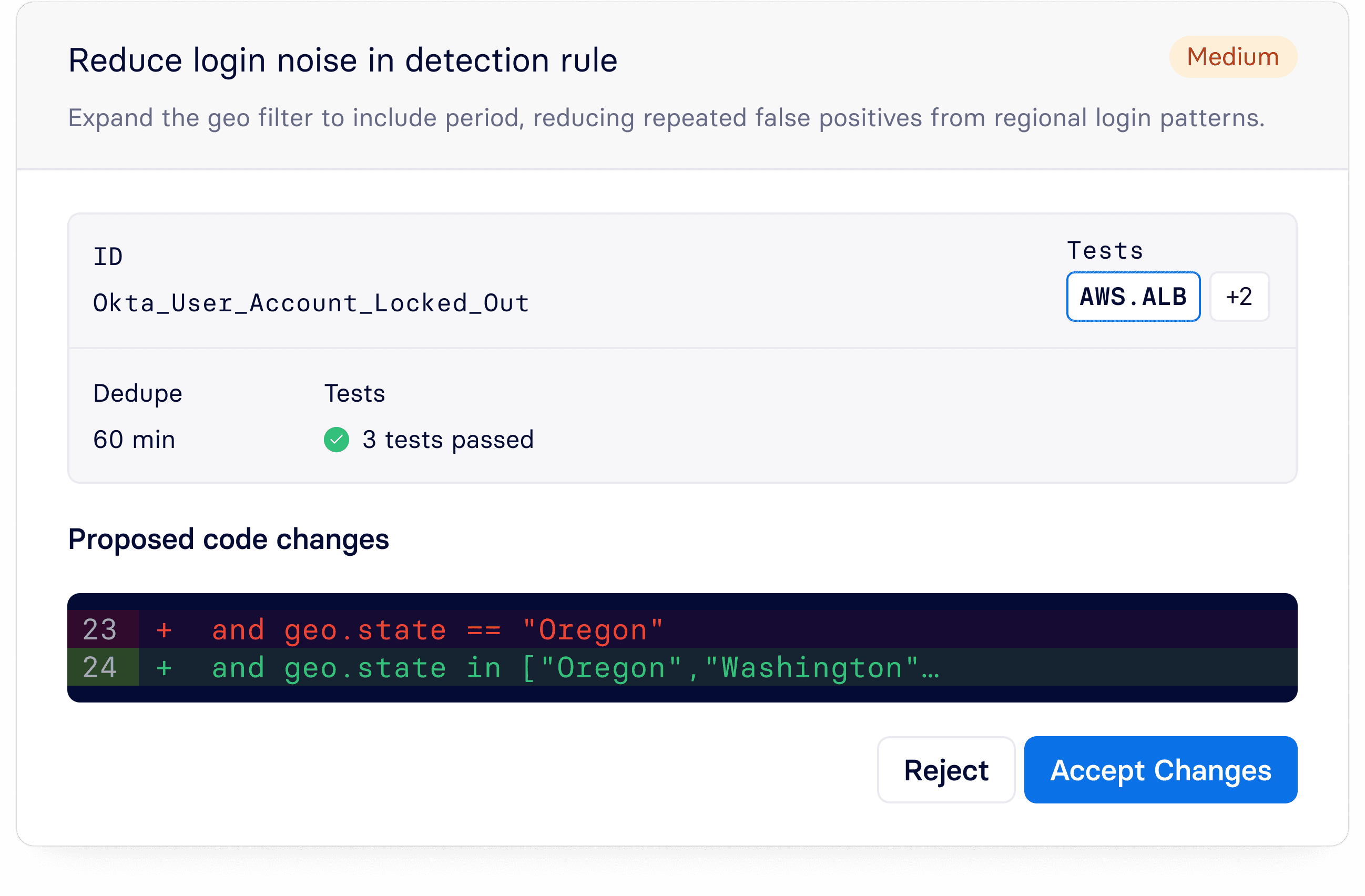 Detections are only as good as the logic behind them. Panther is built on Python, not a proprietary query language or a black box, meaning every detection rule is readable, testable, version-controlled, and modifiable by AI. This is what makes the closed loop possible.
