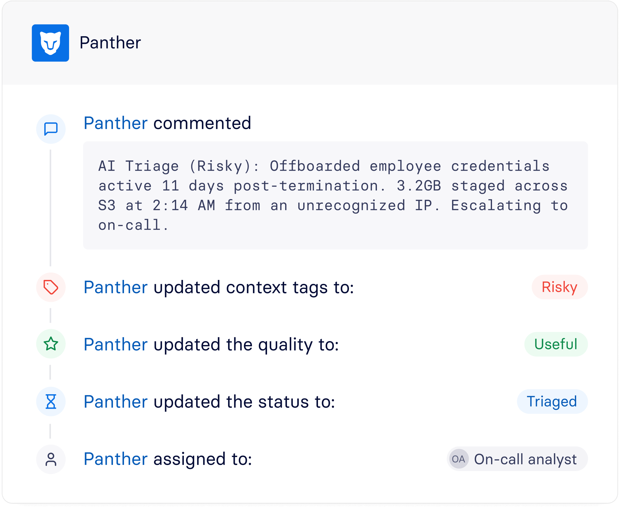 Every triage outcome, investigation, and decision feeds back into the system. The longer Panther runs, the smarter it gets.