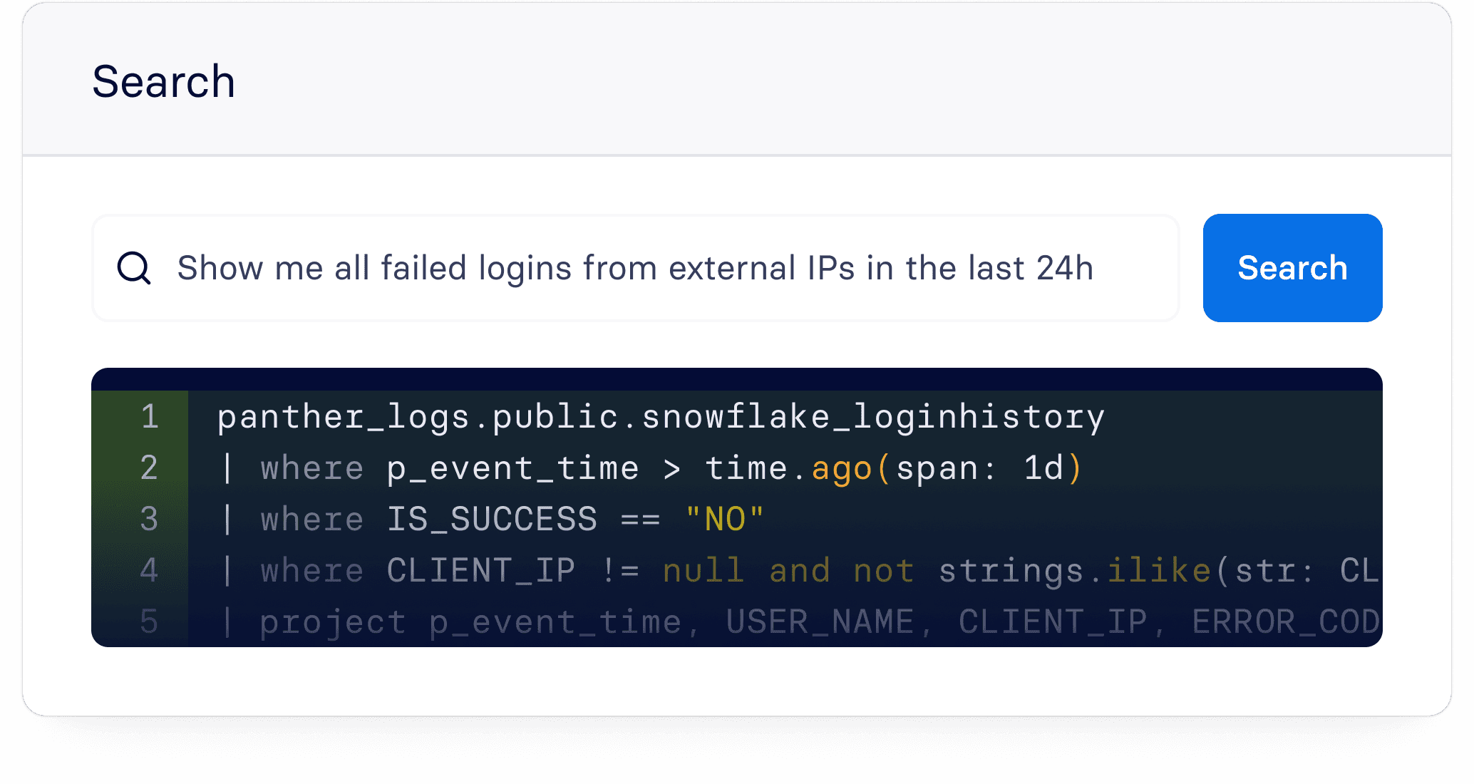 Search across all your security data in plain English, SQL, or PantherFlow — no proprietary query language to learn.