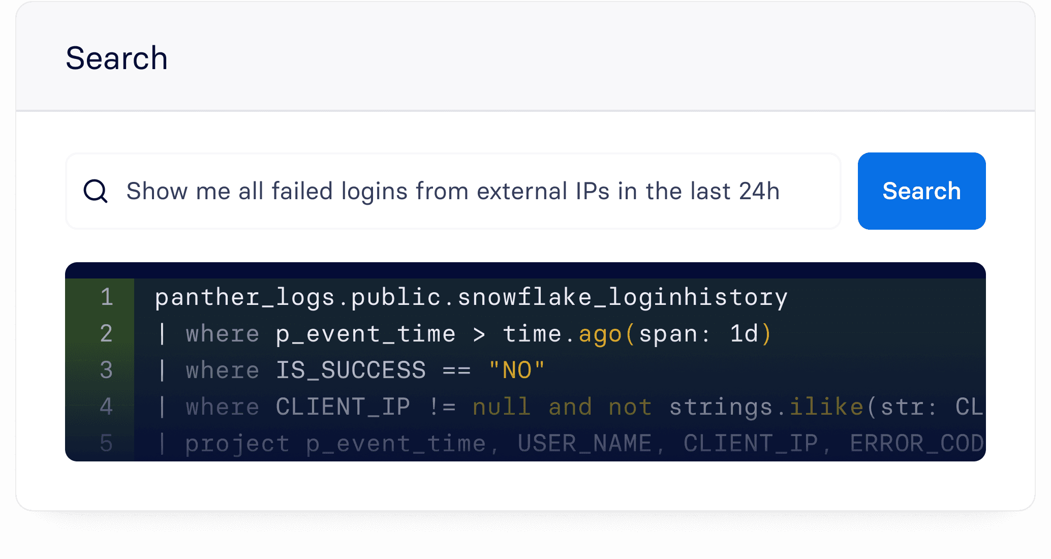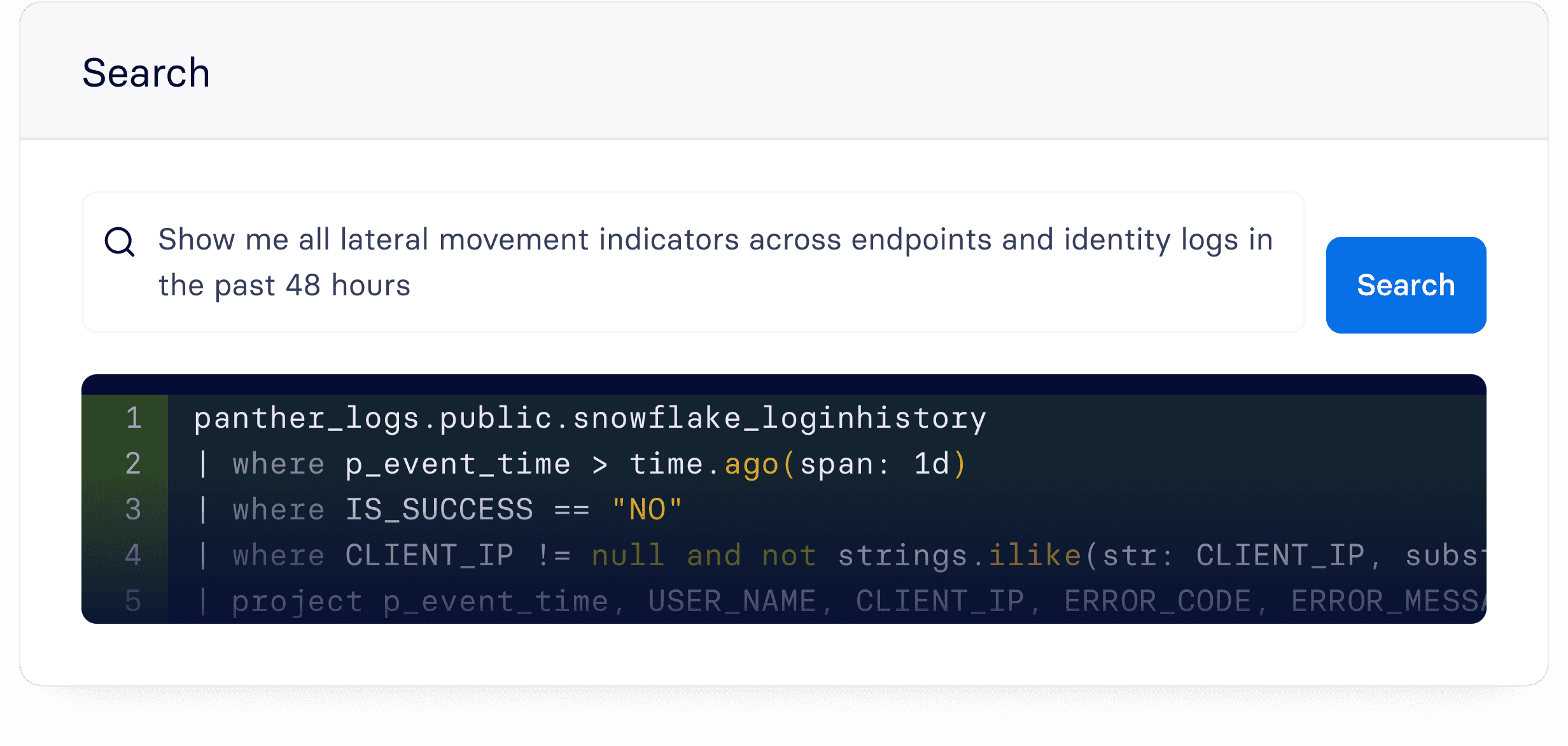 Search across your entire data lake in natural language so any analyst can investigate a hypothesis without learning a proprietary query language.