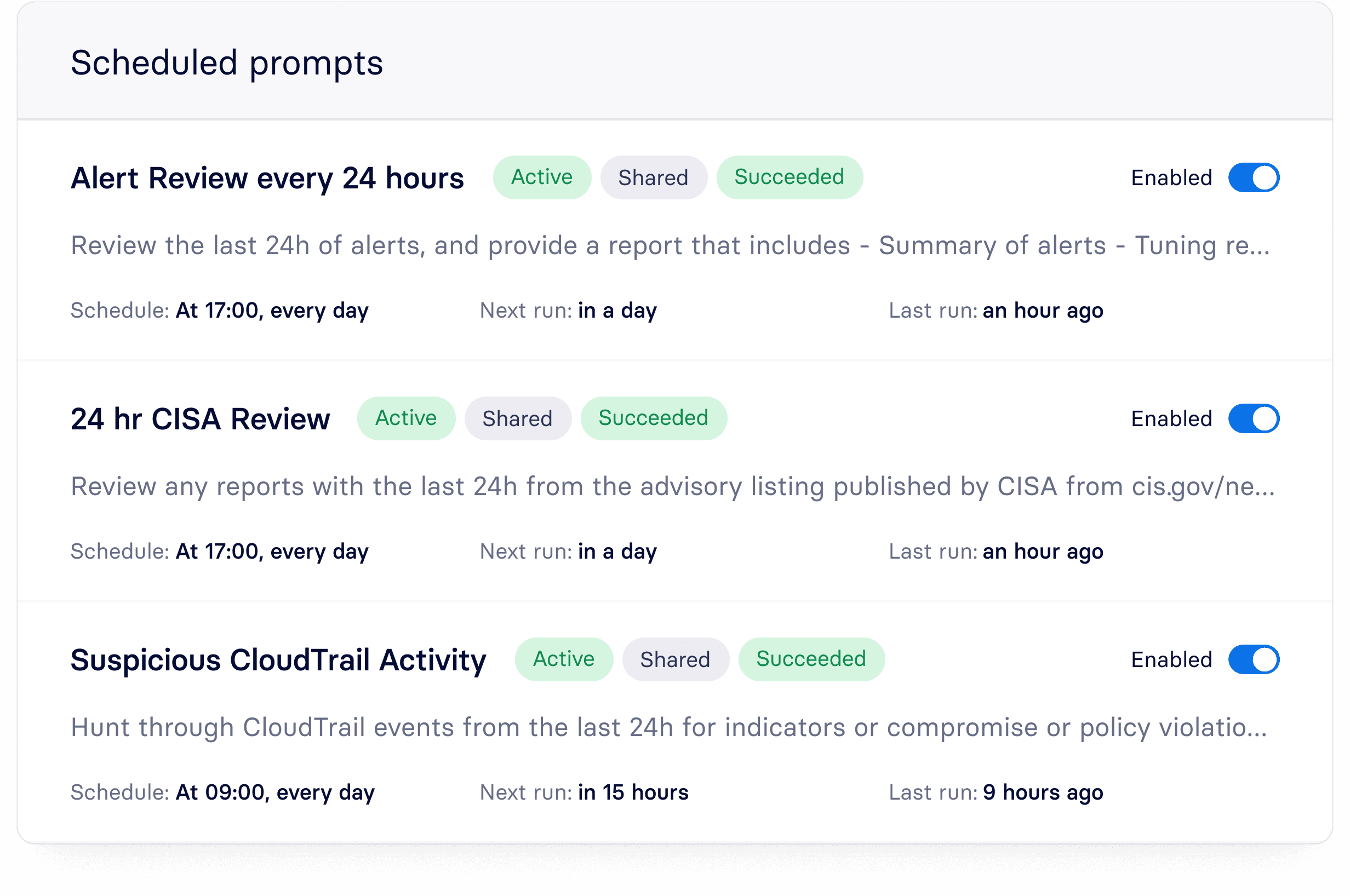 Set up recurring prompts once and Panther runs them automatically, surfacing threats and patterns across your environment on a continuous cadence.