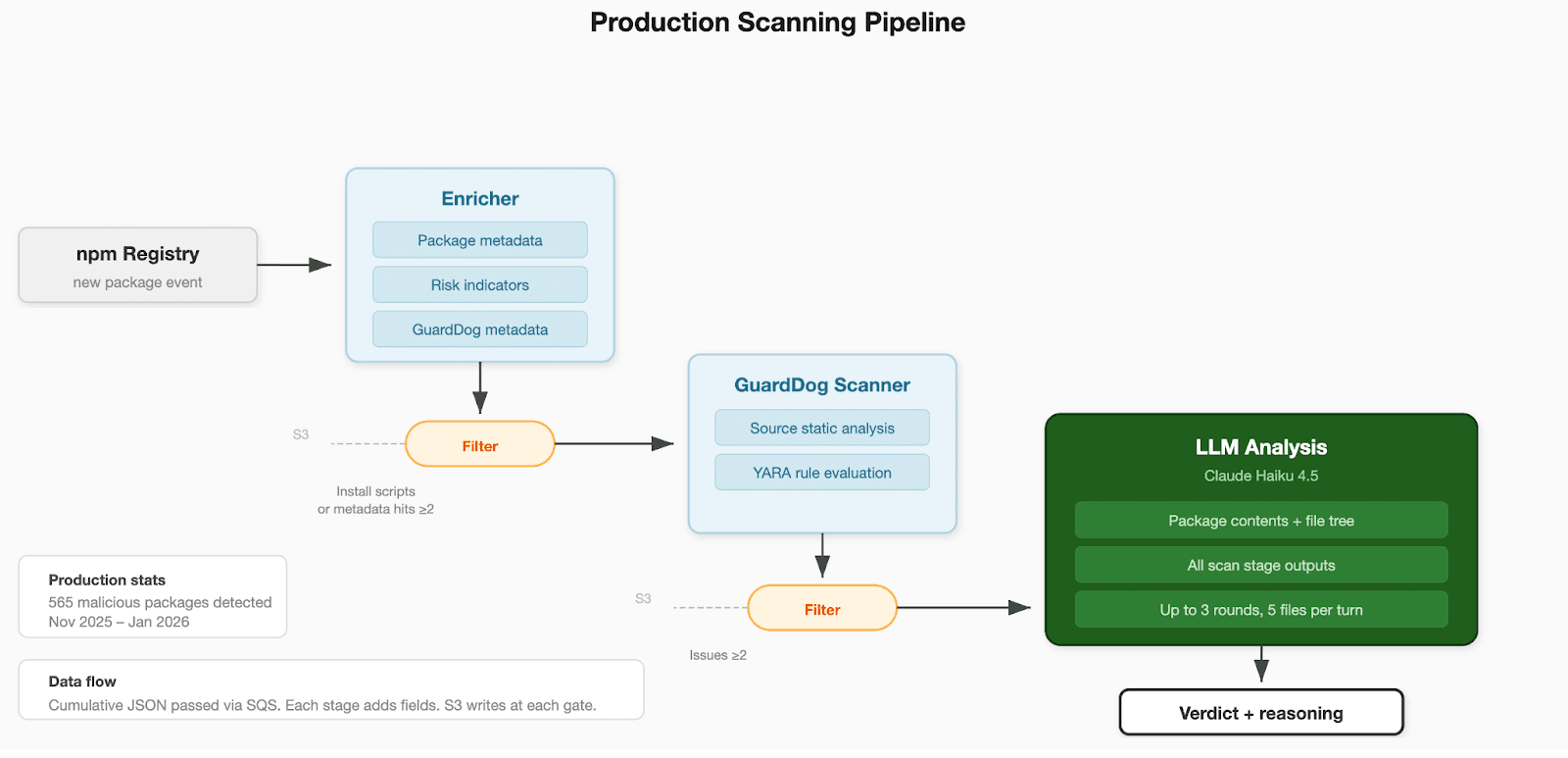 Our production scanner monitors the npm registry in real time, filtering new packages on install script presence and metadata risk indicators before committing them to the full LLM analysis pipeline.